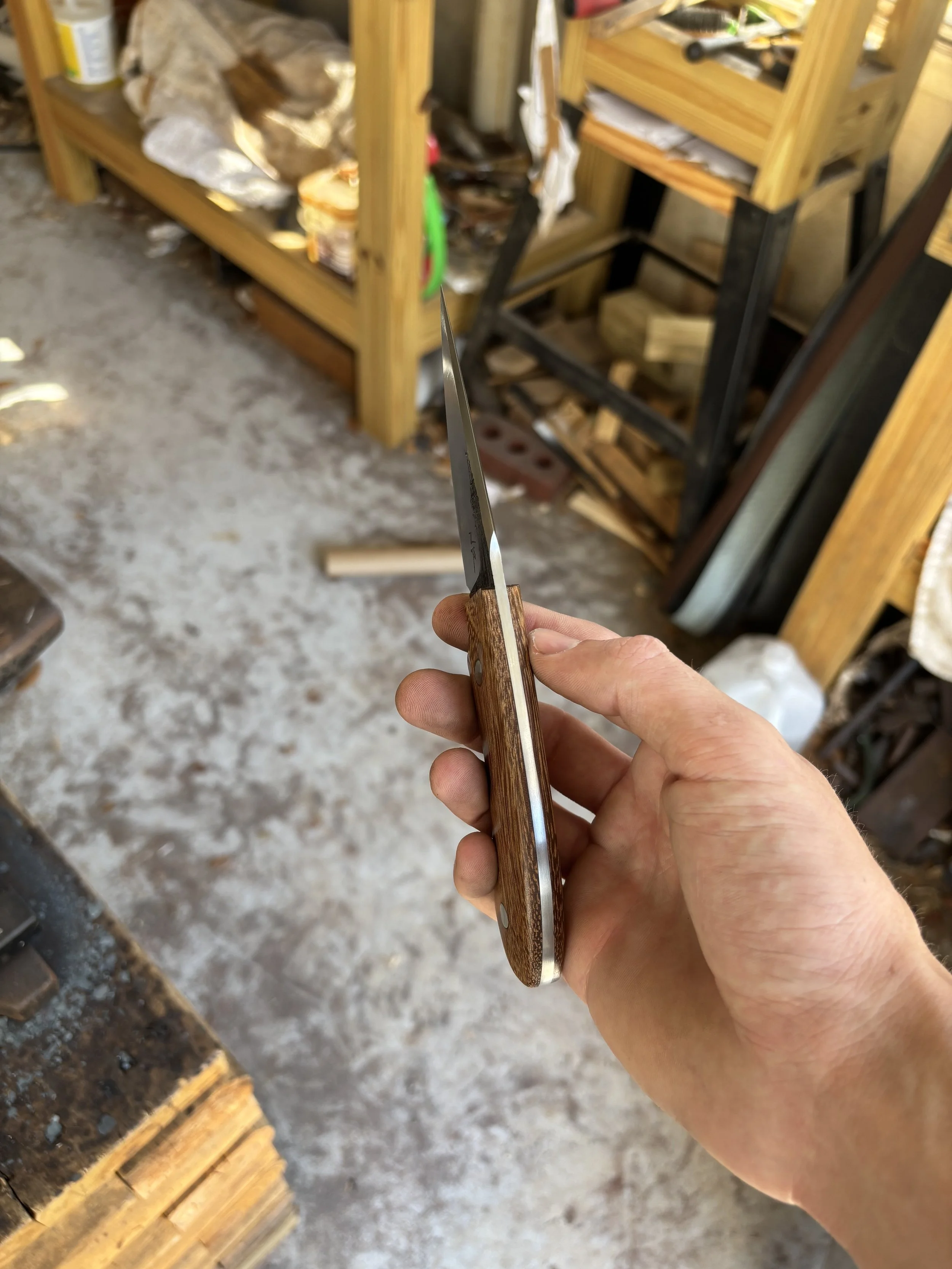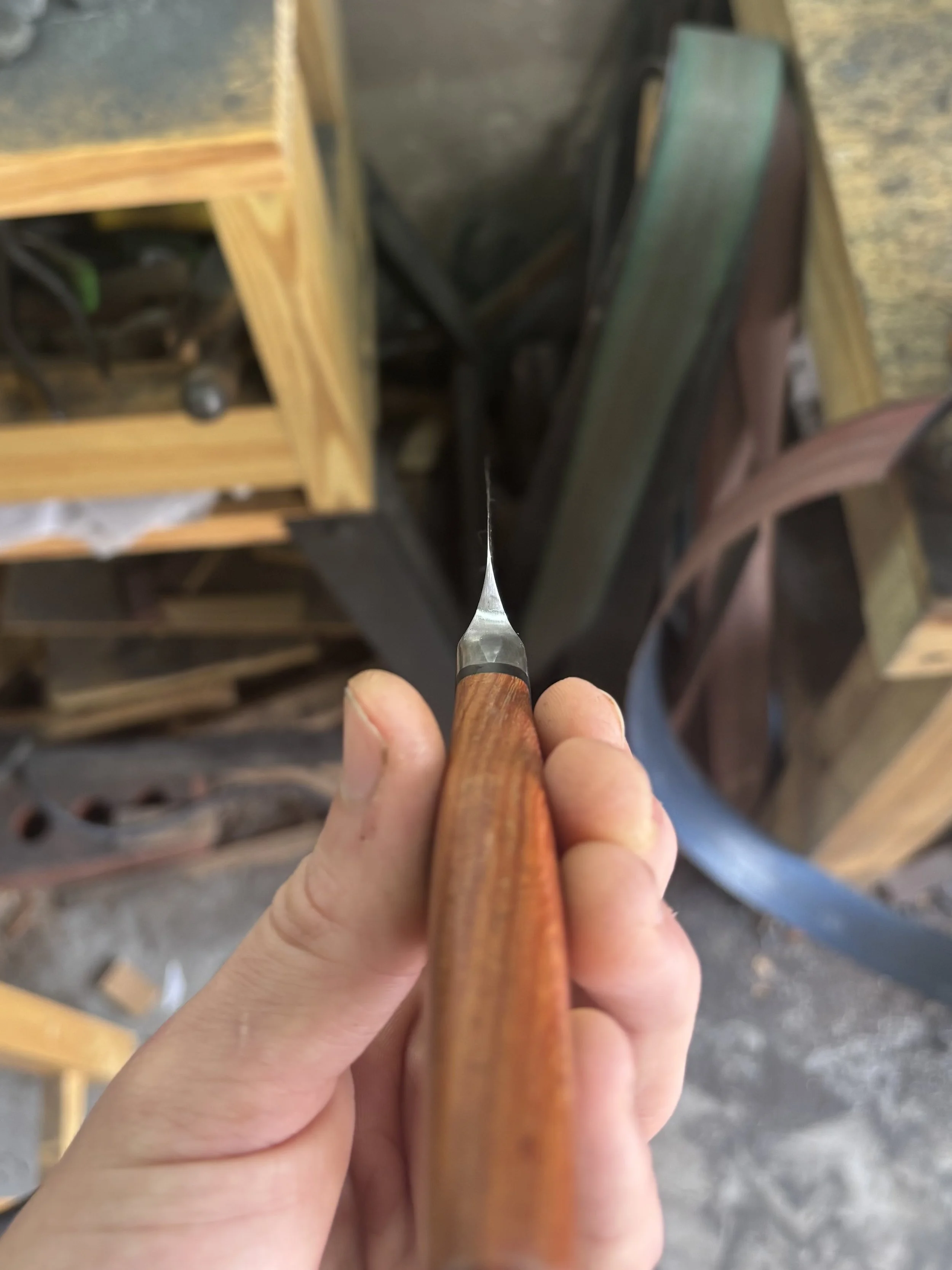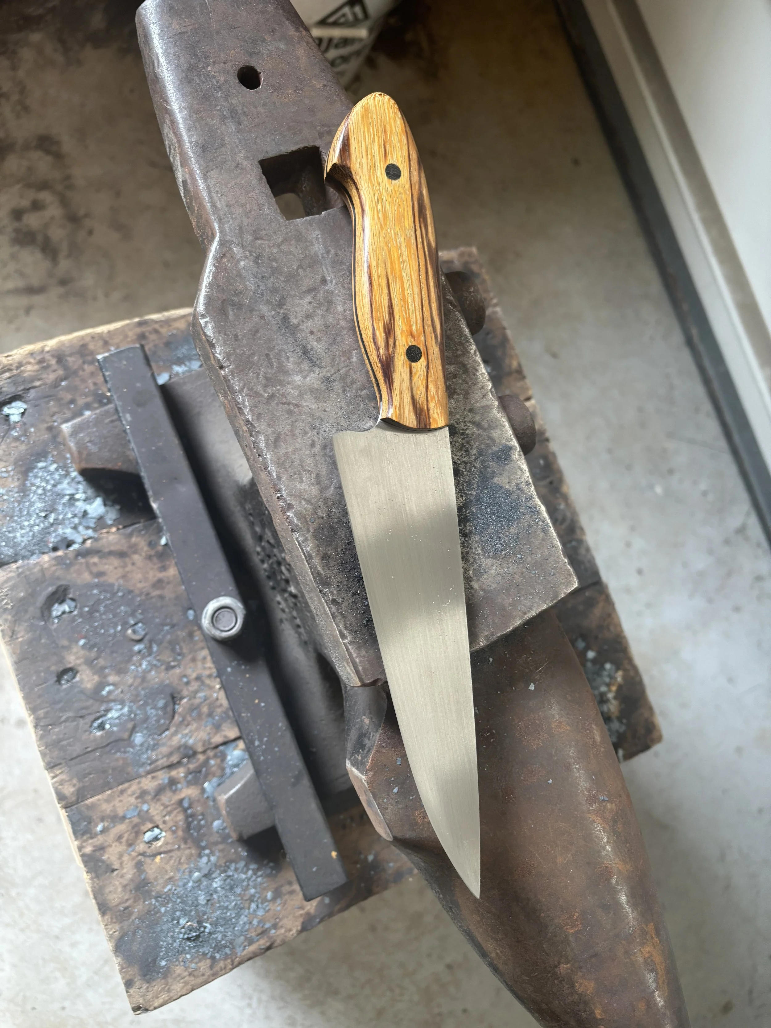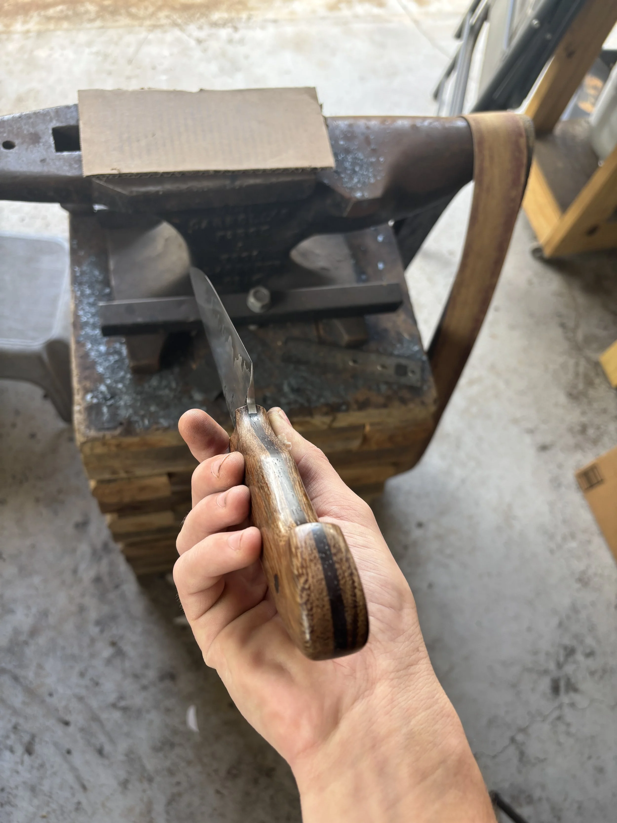 I use high carbon steels which can get harder than most stainless steels, have finer grain, and are easier to sharpen. High carbon steels aren’t corrosion resistant but that allows them to form a patina which develops slowly from use and is both protective against rust and very unique to the knifes owner due to its formation being caused by skin oils, different foods, and how its cared for. I use handle materials that I know will hold up over time whether it’s hard exotic wood or synthetic materials, I make sure it’s meant to last. My handles are attached to the knife with epoxy and not all epoxy is the same, some epoxy is hard, brittle and only lasts a few years. The epoxy I use is the best for knife handles because it’s flexible, very strong, and very long lasting.