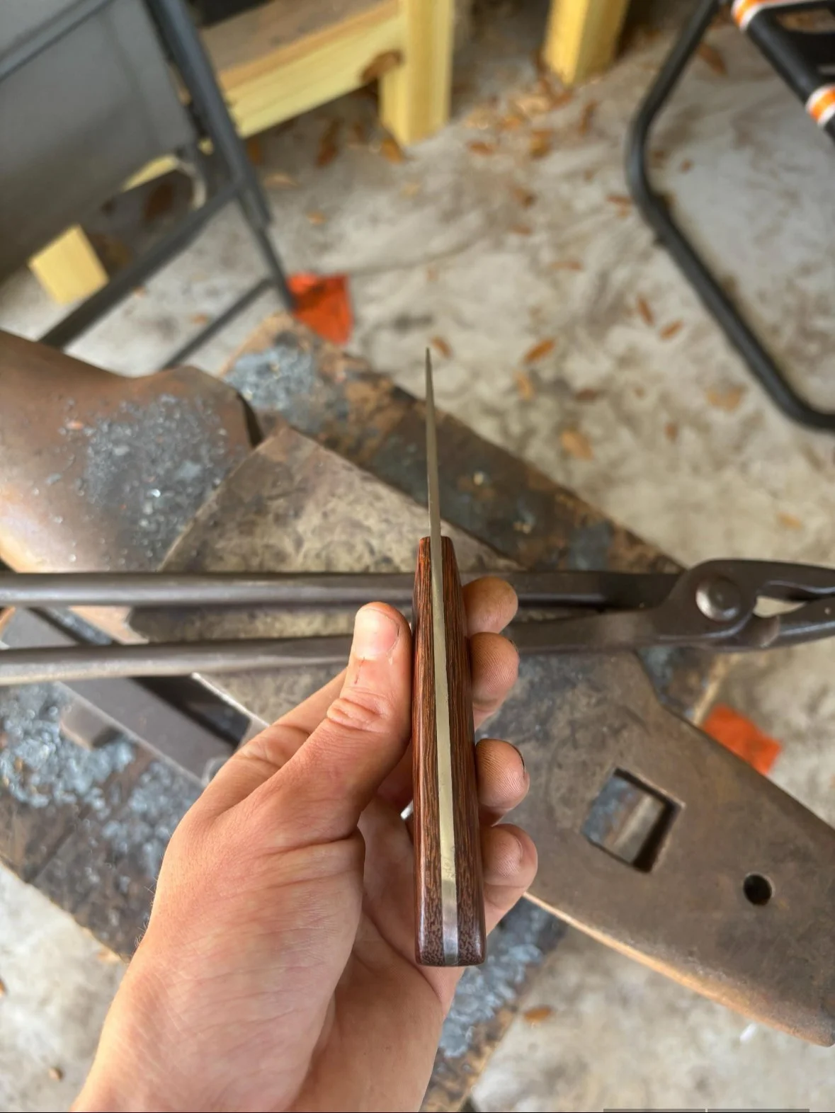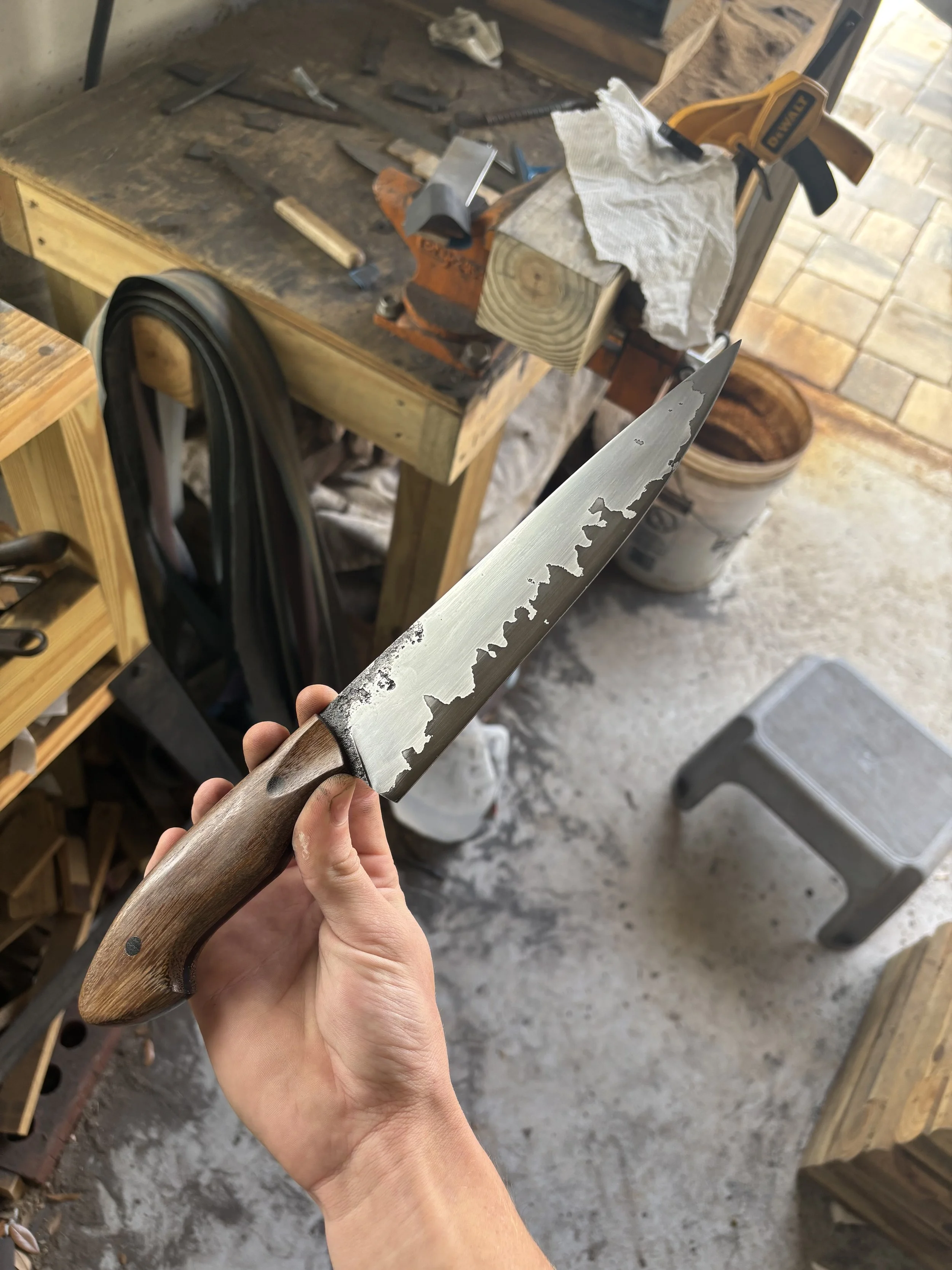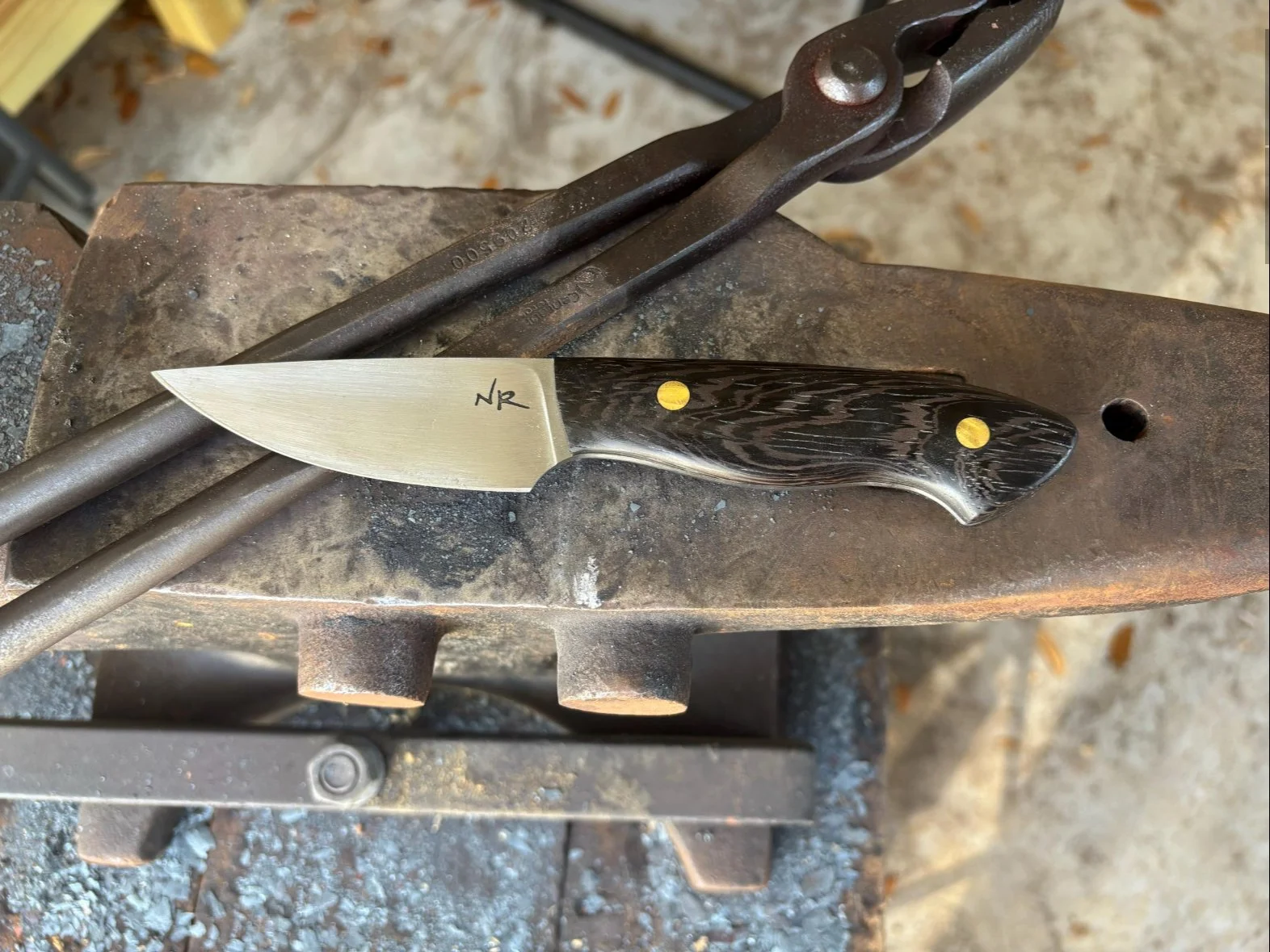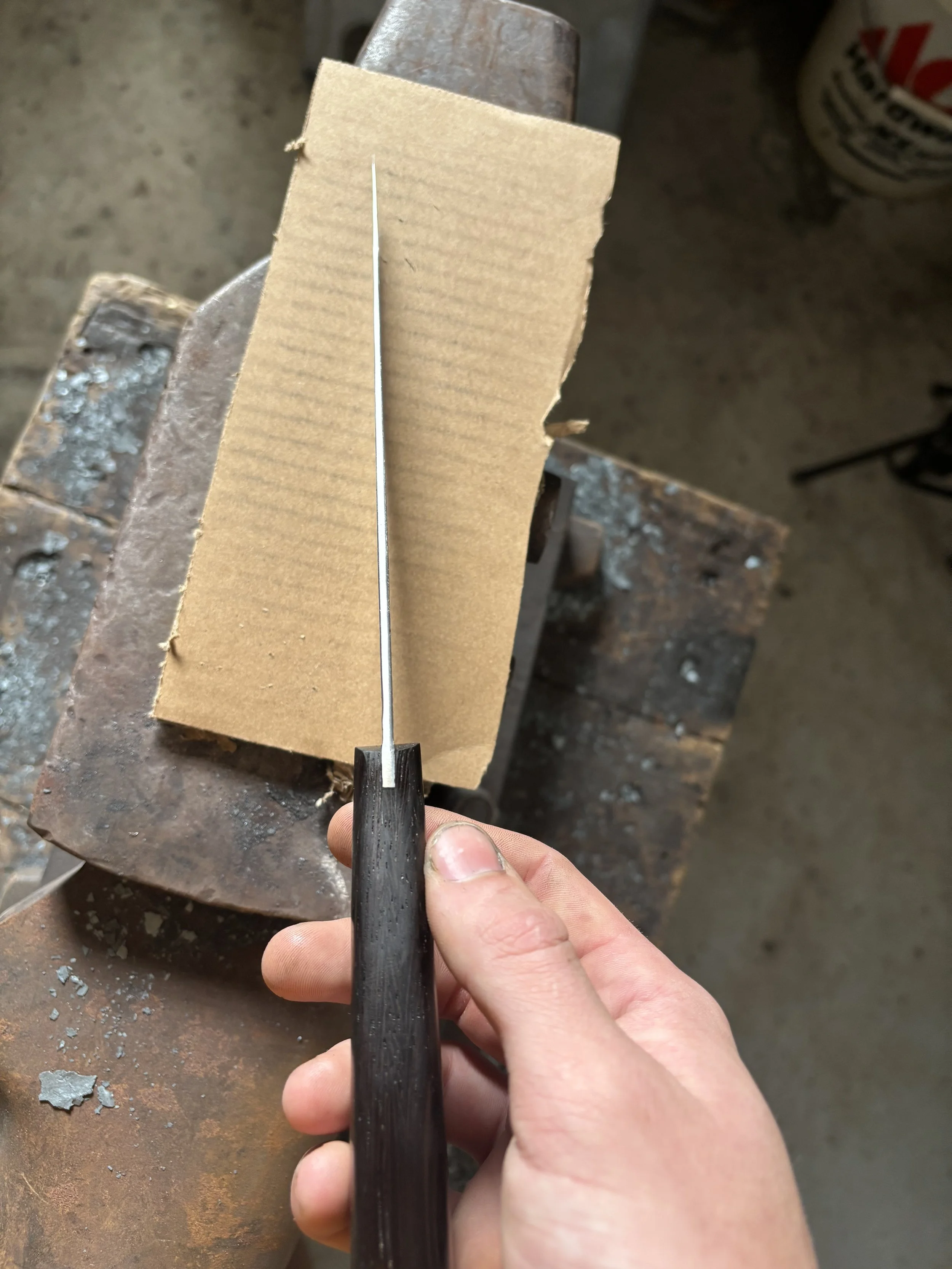I use high carbon steels which can get harder than most stainless steels, have finer grain, and are easier to sharpen. High carbon steels aren’t corrosion resistant but that allows them to form a patina which develops slowly from use and is both protective against rust and very unique to the knifes owner due to its formation being caused by skin oils, different foods, and how its cared for. I use handle materials that I know will hold up over time whether it’s hard exotic wood or synthetic materials, I make sure it’s meant to last. My handles are attached to the knife with epoxy and not all epoxy is the same, some epoxy is hard, brittle and only lasts a few years. The epoxy I use is the best for knife handles because it’s flexible, very strong, and very long lasting.
