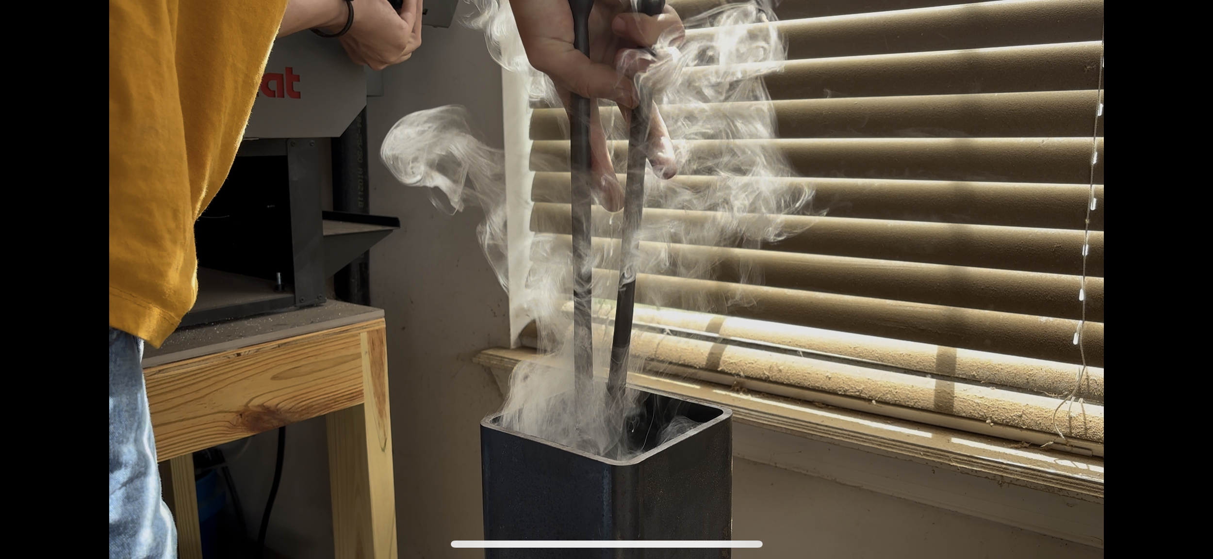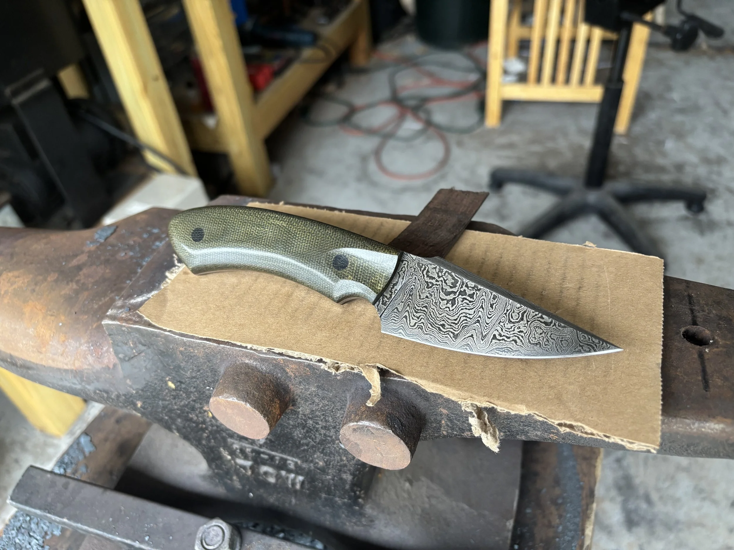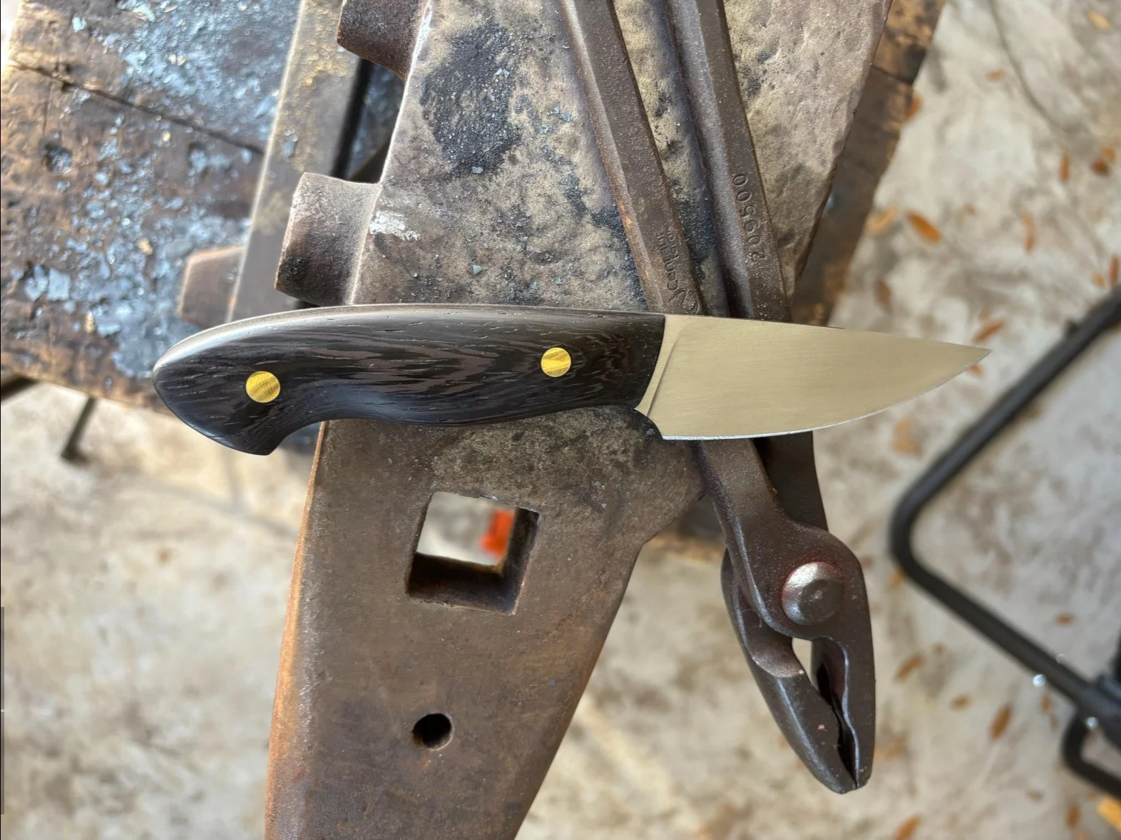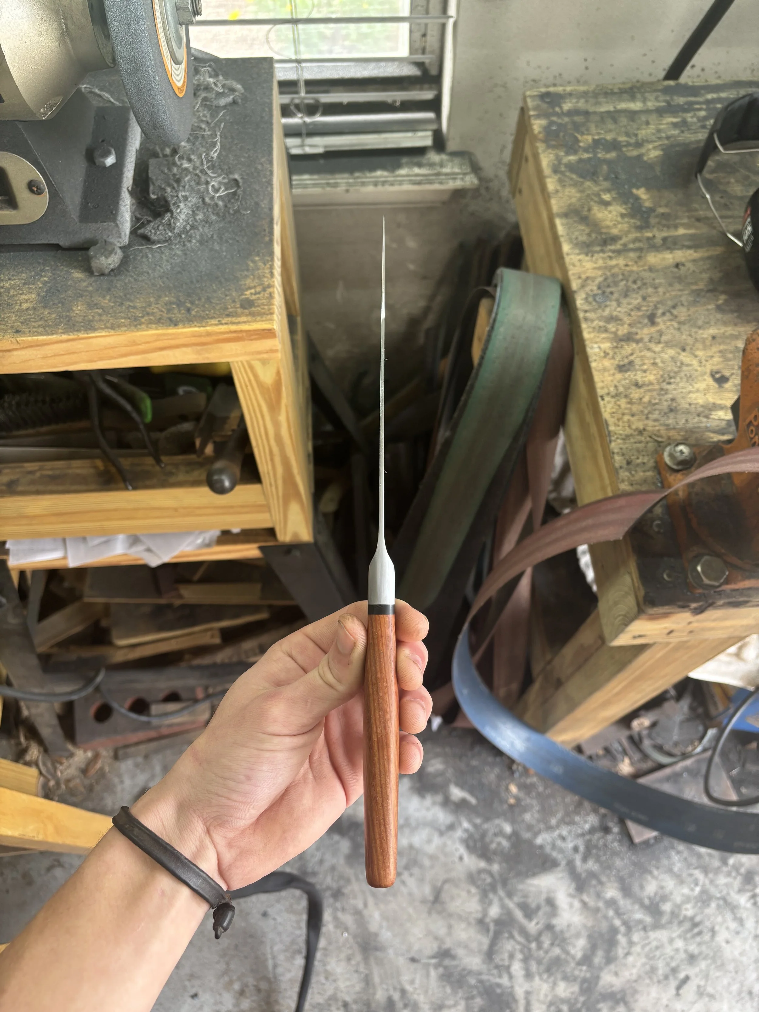 I use high carbon steels which can get harder than most stainless steels, have finer grain, and are easier to sharpen. High carbon steels aren’t corrosion resistant but that allows them to form a patina which develops slowly from use and is both protective against rust and very unique to the knifes owner due to its formation being caused by skin oils, different foods, and how its cared for. I use handle materials that I know will hold up over time whether it’s hard exotic wood or synthetic materials, I make sure it’s meant to last. My handles are attached to the knife with epoxy and not all epoxy is the same, some epoxy is hard, brittle and only lasts a few years. The epoxy I use is the best for knife handles because it’s flexible, very strong, and very long lasting.